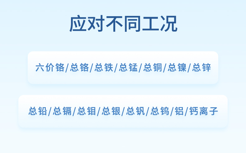 聯(lián)測在線水質(zhì)重金屬檢測儀可監(jiān)測:六價鉻/總鉻/總鐵/總/總銅/總鎳/總鋅/總鉛/總鍋/總鉑/總銀/總釩/總鎢/鋁/鈣離子。