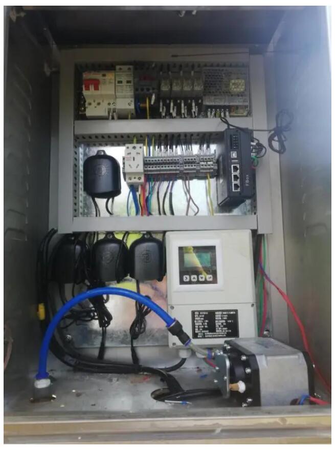 鄒工在現(xiàn)場調(diào)試,電磁流量計進行計量,數(shù)據(jù)通過云平臺進行監(jiān)控,現(xiàn)場總計裝有56臺分體式電磁流量計。