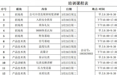 此次培訓(xùn)會(huì)主要圍繞公司規(guī)章制度、入職安全、商務(wù)禮儀等職場(chǎng)類(lèi)知識(shí)以及水質(zhì)、溫度、壓力等儀表基礎(chǔ)知識(shí)兩方面展開(kāi),并邀請(qǐng)了公司里十余位經(jīng)驗(yàn)豐富的資深講師。