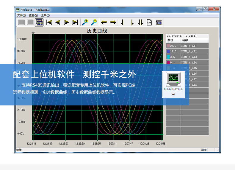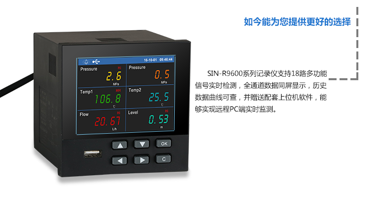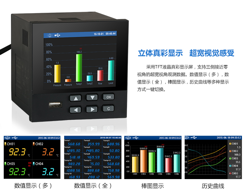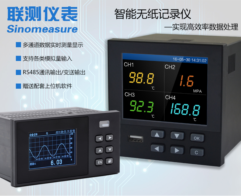 無紙記錄儀是將采集的數(shù)據(jù)/運(yùn)算數(shù)據(jù)以時(shí)間為基軸記錄在儀器內(nèi)部的存儲(chǔ)系統(tǒng)中,無消耗任何常用的記錄設(shè)施,如:紙張、筆墨。記錄在儀器內(nèi)部的存儲(chǔ)數(shù)據(jù),通過運(yùn)算、模擬后顯示在液晶屏。常用顯示用液晶屏比較廣泛。在液晶屏屏幕上,可以顯示數(shù)字顯示、棒圖顯示、曲線顯示、報(bào)警列表等。無紙記錄儀采集的數(shù)據(jù),常用的有:溫度、壓力、流量、液位、電壓、電流、濕度、頻率、振動(dòng)、轉(zhuǎn)速等。